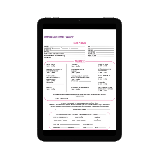 Ficha anamnese elegante e personalizável para aprimorar a conexão com suas clientes. Este recurso não apenas tornará seu trabalho mais eficiente, mas também proporcionará uma experiência de serviço única e atenciosa.